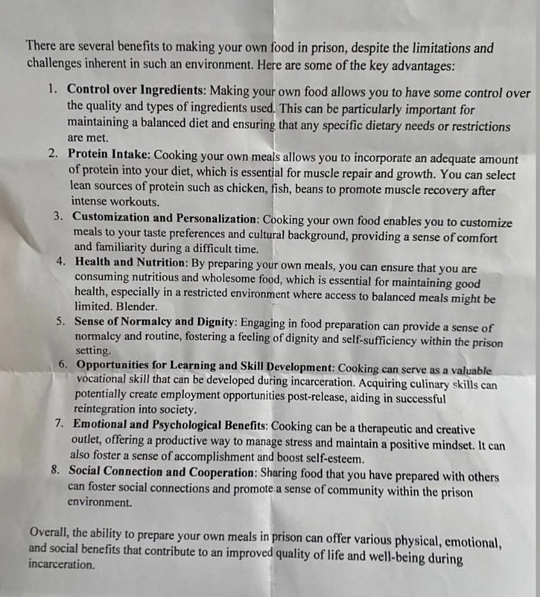 The men at Sulkava were told I was visiting and one Lithuanian prisoner wanted to share some thoughts on the food culture of the prison and the self-catering facilities. He’d spent some time typing up his thoughts - in perfect English! - and getting a staff member to print them off. He invited me into his housing unit - one of the only private apartments in Sulkava and home to a bedroom and a small kitchen/diner.
